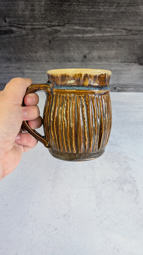 I wanted the outside of this mug to resembled tree bark, and really love the effect the different glazes had on the texture I carved. The pop of blue below the rim and flowing into the deeper carved areas looks even cooler in person!
